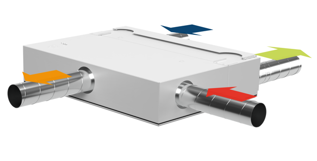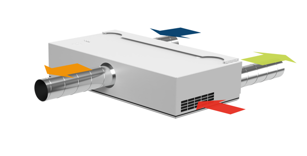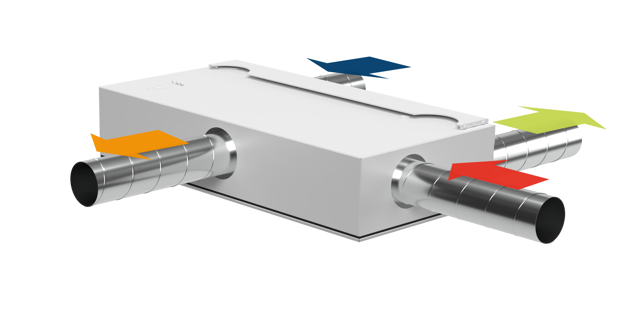 AM 150 er et vegg-/takhengt ventilasjonsanlegg i en horisontal versjon hvor luftinntak og avkast føres bakover fra anlegget.
